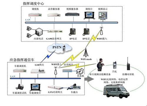 相對(duì),應(yīng)急指揮車(chē)配有車(chē)載Wi-Fi基站,接入園區(qū)內(nèi)鋪設(shè)的無(wú)線寬帶網(wǎng)絡(luò),在園區(qū)無(wú)線寬帶覆蓋范圍內(nèi)實(shí)現(xiàn)與指揮中心的語(yǔ)音、視頻、數(shù)據(jù)的雙向傳輸。當(dāng)Wi-Fi mesh網(wǎng)絡(luò)無(wú)信號(hào)覆蓋,指揮車(chē)還可通過(guò)2G\3G、無(wú)線集群等方式與指揮中心進(jìn)行多網(wǎng)融合語(yǔ)音通信。