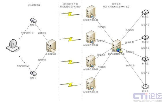 帶寬接入:用于國內(nèi)到國際的出口帶寬,使用大小為50M獨享,以滿足在有效時間內(nèi)可完成所有內(nèi)容的傳輸;用于國外用戶響應發(fā)布的P2P流媒體服務器出口帶寬為100M,可滿足至少2000并發(fā)用戶的P2P直播點播觀看需求。