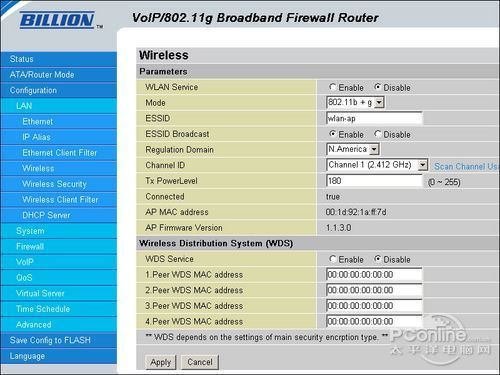 BiPAC 6404VGP的無線部分符合802.11b/g規(guī)范,最高無線速率可達54Mbps。無線部分的常規(guī)設置例如WIFI功能開關(guān)、SSID名稱自定義、SSID隱藏、信道選擇、WDS無線橋接等功能齊全。