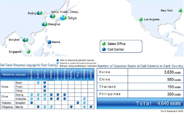 transcosmos于1989年在美國建立了海外分部并于2001年開始進(jìn)軍亞洲的海外市場提供呼叫中心和數(shù)碼營銷服務(wù)。Transcosmos在呼叫中心服務(wù)上共投資450,000,000日元而且在6個(gè)國家的10所城市發(fā)展了本地的呼叫中心服務(wù)。同時(shí),transcosmos為了滿足客戶促進(jìn)業(yè)務(wù)發(fā)展的需求,在亞洲各國戰(zhàn)略性地設(shè)置了執(zhí)行官以及總監(jiān)級別的管理層,也建立了可以提供10種主要亞洲語言的構(gòu)架。通過transcosmos多樣分部的統(tǒng)一管理,提高了服務(wù)質(zhì)量并且在不斷累積的業(yè)務(wù)訣竅和知識(shí)上達(dá)到業(yè)務(wù)效能。