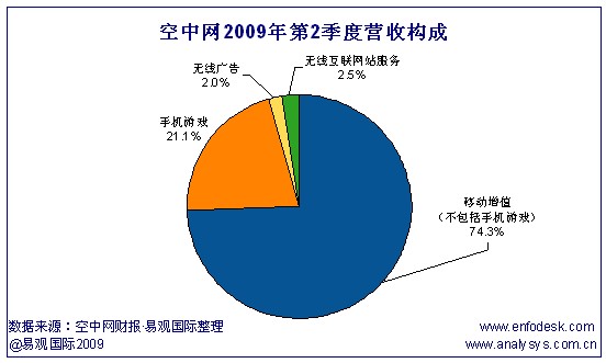 空中網2009年第2季度總營收為3230萬美元,其中總無線增值服務(不包括手機游戲)營收為2393萬美元,同比增長10%,比上一季度增長1%,占總營收的74.09%;手機游戲占總營收的21.05%,比上一季度增長38%;這一季度,空中網將無線廣告和無線互聯(lián)網站服務的收入共同歸為無線互聯(lián)網服務營收,總值為156萬美元,其中41%來自于無線廣告,59%來自于空中網無線互聯(lián)網站服務(包括虛擬物品銷售以及手機游戲和無線增值服務的交叉銷售)。易觀國際(Analysys