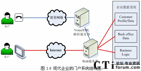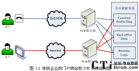 隨著Internet和Web技術(shù)的迅速發(fā)展,越來(lái)的企業(yè)開始建立自己的門戶網(wǎng)站,同時(shí)又擁有自己的IVR系統(tǒng)(如圖3.8所示),但是兩套系統(tǒng)完全獨(dú)立,語(yǔ)音系統(tǒng)和數(shù)據(jù)系統(tǒng)沒有任何交互或者只有很少的交互。而建立IVR系統(tǒng)的目標(biāo)就是給客戶更好的體驗(yàn),使客戶能方便的通過(guò)電話完成更多以前需要登陸企業(yè)門戶網(wǎng)站,或者親自去企業(yè)或其網(wǎng)點(diǎn)去辦理的業(yè)務(wù),這就需要IVR系統(tǒng)能跟后臺(tái)數(shù)據(jù)系統(tǒng)有更多更好的交互。“語(yǔ)音門戶”的概念出現(xiàn)也愈發(fā)的證明這一點(diǎn)。