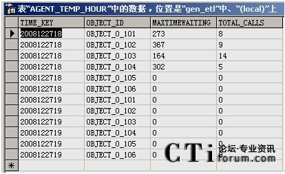 從報表數(shù)據(jù)庫的相應表中,可以看出報表需要統(tǒng)計的數(shù)據(jù)信息都以表單形式列出來。圖中的Time Key表示收集數(shù)據(jù)的具體時刻,object_id表示目標對象在配置數(shù)據(jù)庫中存儲的ID號。MaxTimeWaiting和Total_Calls屬性對應的是根據(jù)模板項要求統(tǒng)計的數(shù)據(jù),分別為最大等待時間和內線呼叫總量。下面利用報表展現(xiàn)工具可以直接將該數(shù)據(jù)展示出來,生成需要的報表。