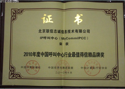 在本次評選中,北京聯(lián)信志誠信息技術(shù)有限公司(簡稱MyComm公司),其核心產(chǎn)品MyCommIPCC獨(dú)享 2010年度中國呼叫中心行業(yè)最值得信賴品牌獎。