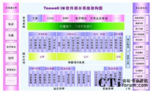 - Toowell DM 具備強大的業(yè)務整合能力,軟件框架基于呼叫中心全方位解決方案,支持訂單、投訴、業(yè)務開通、知識管理等。