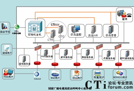 系統(tǒng)主要包含IVR服務(wù)器,CTI服務(wù)器,短信網(wǎng)關(guān),郵件服務(wù)器,傳真服務(wù)器,數(shù)據(jù)庫(kù)服務(wù)器,座席系統(tǒng)等?蛻魮艽蛱胤(hào)碼接入廣電公司客服系統(tǒng),首先由IVR提供自動(dòng)語(yǔ)音服務(wù)。CTI服務(wù)器負(fù)責(zé)所有的電話的路由、排隊(duì)、轉(zhuǎn)接和控制?蛻粼诮邮茏詣(dòng)語(yǔ)音服務(wù)時(shí),如果需要人工幫助,可選擇轉(zhuǎn)入人工座席。由IVR系統(tǒng)向CTI發(fā)出轉(zhuǎn)接請(qǐng)求,完成轉(zhuǎn)接功能。