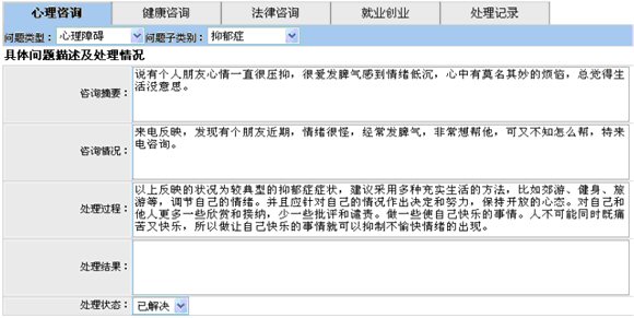 對于每次咨詢的受理以及答復記錄,是青少年咨詢平臺的重要組成部分。針對青少年的心理特點咨詢問題的類別,專門開發(fā)“12355”青少年服務(wù)臺業(yè)務(wù)受理系統(tǒng)。通過對來訪者的資料的登記,以及對咨詢服務(wù)的詳細記錄和電話錄音,今后可方便的查詢服務(wù)臺的的咨詢情況,并能有效的跟蹤處理,青少年遇到的心里、求學、婚姻和法律維權(quán)等方面的訴求。并能快速準確的統(tǒng)計服務(wù)臺的各項服務(wù)的數(shù)據(jù)。
