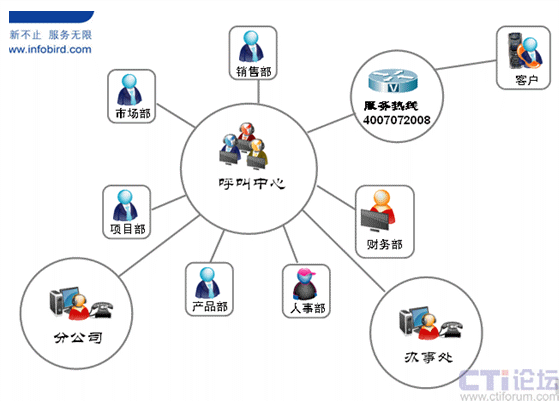 訊鳥軟件現(xiàn)有員工150人,總部位于北京,在上海設(shè)有一個分公司,在廣州、深圳分別設(shè)有一個辦事處。通過將呼叫中心與企業(yè)運(yùn)營管理的融合,大大提高了員工的工作效率,降低了運(yùn)營管理成本。訊鳥軟件副總裁姜冬良先生告訴我們,自2007年6月在企業(yè)運(yùn)營管理中加入呼叫中心之后,所有員工對外聯(lián)系的名片上只有公司的400號碼和員工分機(jī),不再顯示員工的手機(jī),這樣有效的避免了因?yàn)閱T工流失造成的客戶服務(wù)無法及時響應(yīng)的現(xiàn)象,同時,所有員工的工作狀態(tài)可以通過報表系統(tǒng)有效的衡量,尤其是銷售人員和分公司、辦事處人員的工作,管理層可以及時的檢查、監(jiān)督和糾正。