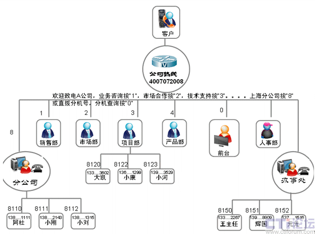 一直以來,呼叫中心座席的形式比較固定,大都通過長期坐在辦公室的人員使用PC機(jī)和電話機(jī)結(jié)合的方式進(jìn)行工作。但是,這種形式顯然不能滿足中小企業(yè)運(yùn)營管理的需要,在以銷售為重的中小企業(yè)中大部分人員并不完全坐在辦公室工作,如客戶經(jīng)理、客戶服務(wù)工程師,即使坐在辦公室,也不會一直在等著接電話,如開發(fā)工程師、生產(chǎn)車間的人員等等。如何既要滿足企業(yè)運(yùn)營的需要,又要實(shí)現(xiàn)呼叫的管理和分配呢?我們只需要將座席的形式簡化,將呼叫分配的目標(biāo)擴(kuò)大就可以了。手機(jī)是目前最常見和普遍的通信工具,只要我們將手機(jī)做為座席進(jìn)行管理,既不改變現(xiàn)有的組織架構(gòu),又能充分利用呼叫分配工作并對工作人員進(jìn)行管理,這將大大提高中小企業(yè)運(yùn)營管理的靈活性和變通性。企業(yè)組織架構(gòu)如下: