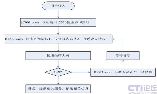 流程圖表示了正常工作期間的流程,實(shí)際技術(shù)流程會(huì)因?yàn)槭欠裨诠ぷ鲿r(shí)間、坐席人員是否繁忙等多種因素考慮,設(shè)置自動(dòng)語音內(nèi)容、語音留言等功能。
