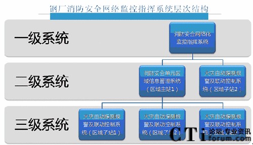 三級系統(tǒng)為“消防安全監(jiān)控指揮系統(tǒng)”,設在消防安全監(jiān)控指揮中心即新建廠區(qū)管控中心處,是新廠區(qū)的火災等事故信息收集、匯總、處理的中心,其功能為:①自動獲取或通過火災報警電話獲取二級系統(tǒng)的火災信息(火災發(fā)生的分廠名稱、具體工藝系統(tǒng)分區(qū)等),與二級系統(tǒng)進行實時信息交互,并對二級系統(tǒng)實施指揮調度;②與廠區(qū)內外的消防及其它搶險救災機構(醫(yī)療、交通、電力等)互聯(lián)互動;③與全廠級生產信息管理中心進行信息交互和應急聯(lián)動。
