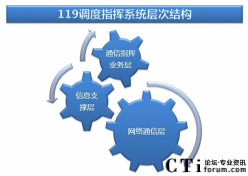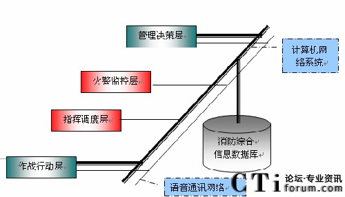 通過對消防安全監(jiān)控指揮中心業(yè)務的分析,引進先進的數(shù)據通信網絡和語音通訊網絡,我們可以將未來的消防業(yè)務層次抽象地概括為四層(如圖所示):管理決策層、火警監(jiān)測層、指揮調度層和作戰(zhàn)行動層。與管理決策層對應的組織機構為消防通信指揮中心;與火警檢測層、指揮調度層對應包括消防指揮中心的接處警子系統(tǒng)、指揮調度等子系統(tǒng);與作戰(zhàn)行動層對應的組織機構為消防站(消防隊)和消防車及消防隊員。