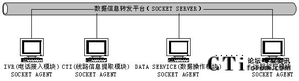 SERVER)上,程序登錄后會自動得到SOCKET SERVER分配的一個節(jié)點(diǎn)號。從此,系統(tǒng)中的各個模塊就可以通過數(shù)據(jù)信息轉(zhuǎn)發(fā)平臺方便的進(jìn)行信息交互。