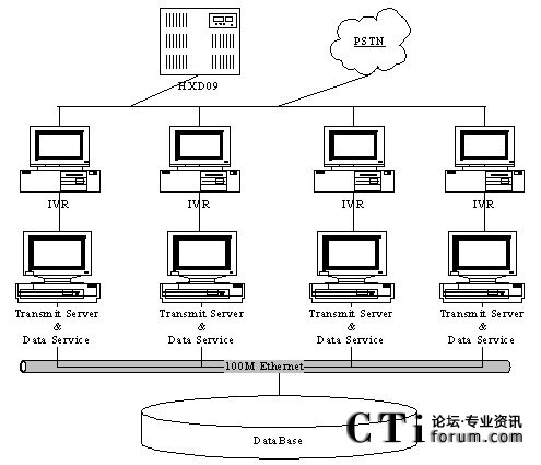 語音接入處理部分主要完成用戶的語音話路接入功能。其中:HXD09語音交換機(jī)可以支持七號信令和一號信令的數(shù)字E1線路的接入。HXD09的IVR完成自動業(yè)務(wù)受理功能,實(shí)現(xiàn)系統(tǒng)7*24小時不間斷服務(wù)。CTI完成對排隊(duì)機(jī)的監(jiān)視、控制任務(wù),并能夠?qū)崟r的提供每個語音通道的信息配合IVR完成自動繳費(fèi)業(yè)務(wù)的實(shí)現(xiàn)。