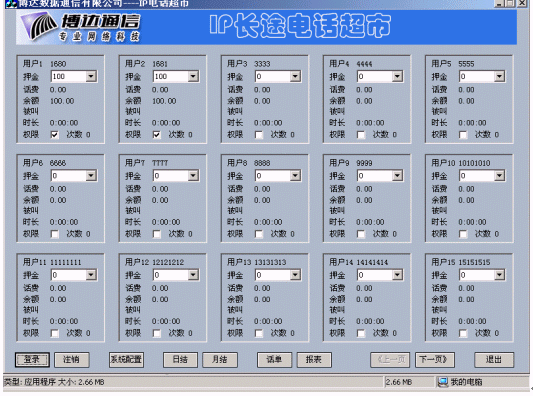 博達(dá)公司在IP電話認(rèn)證的基礎(chǔ)上開發(fā)的IP電話計費(fèi)計費(fèi)系統(tǒng),實現(xiàn)了用戶管理、卡用戶批量生成、費(fèi)率設(shè)置、折扣設(shè)置、話單查詢、帳務(wù)查詢、管理統(tǒng)計、運(yùn)營分析等功能,為電信運(yùn)營商的運(yùn)營和企業(yè)用戶對IP電話的內(nèi)部管理和服務(wù)提供了有利條件。