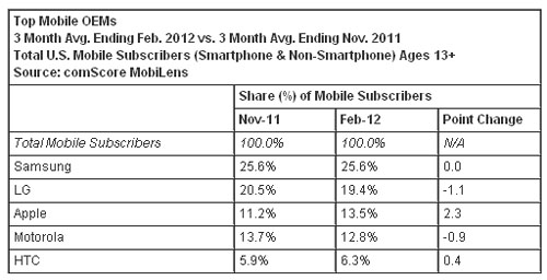 按截至今年2月份的三個月的平均數(shù)計算,美國13歲以上的手機(jī)用戶數(shù)為2.34億。三星名列手機(jī)原始設(shè)備制造商之首,占有美國手機(jī)市場25.6%的份額;LG電子名列第二,占有19.4%的市場份額;蘋果排名第三,占有13.5%的市場份額(上升2.3個百分點(diǎn));摩托羅拉排名第四,占有12.8的市場份額;HTC排名上升至第五,占有6.3%的市場份額(上升0.4個百分點(diǎn))。
