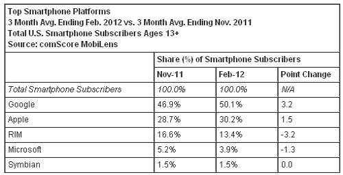 按截至今年2月份的三個月的平均數(shù)計算,美國智能手機(jī)用戶數(shù)超過1.04億人,相比截止去年11月的三個月的平均數(shù)增長14%。谷歌Android操作系統(tǒng)在美國手機(jī)市場的份額超過50%,相比去年同期上升了17個百分點(diǎn);蘋果iOS操作系統(tǒng)排名第二,其市場份額為30.2%(與去年同期相比上升了5個百分點(diǎn));其后依次是RIM黑莓操作系統(tǒng)的13.4%,微軟Windows