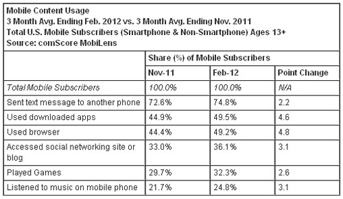 按截至今年2月份的三個月的平均數(shù)計算,美國手機(jī)用戶中有74.8%的用戶利用手機(jī)發(fā)送短信,相比截止去年11月的三個月上升2.2個百分點(diǎn);有49.5%的用戶使用了下載的應(yīng)用程序(上升4.6個百分點(diǎn)),有49.2%的用戶使用瀏覽器(上升4.8個百分點(diǎn)),有36.1%的用戶訪問社交網(wǎng)站或博客(上升了3.1個百分點(diǎn));有32.3%有用戶利用手機(jī)玩游戲(上升2.6個百分點(diǎn)),有24.8%的用戶利用手機(jī)聽音樂(上升3.1個百分點(diǎn))。