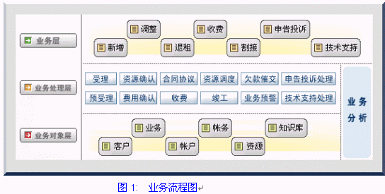 網(wǎng)通一站服務業(yè)務系統(tǒng):實現(xiàn)業(yè)務受理、資源確認、費用確認、合同/協(xié)議、收費、資源調度、竣工、業(yè)務預警、申告投訴處理、技術支持處理功能。其業(yè)務流程如下圖: