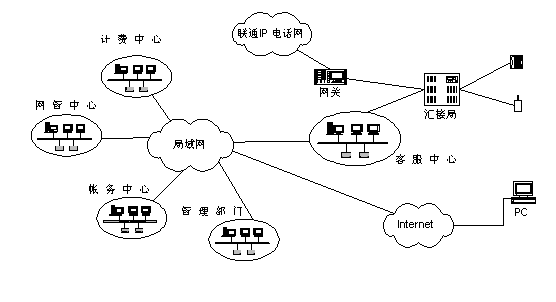 聯(lián)通北京分公司將客戶服務(wù)系統(tǒng)與現(xiàn)有計費、營業(yè)、帳務(wù)系統(tǒng)進(jìn)行組織,形成了一個有機的結(jié)合體,能夠充分發(fā)揮出現(xiàn)有系統(tǒng)的優(yōu)勢。客戶服務(wù)系統(tǒng)從營業(yè)帳務(wù)系統(tǒng)提取相關(guān)用戶資料,建立客戶服務(wù)的系統(tǒng)資料庫,從計費系統(tǒng)提取相關(guān)用戶話費資料等供查詢使用。同時客服系統(tǒng)還將與北京聯(lián)通現(xiàn)有的計費、營業(yè)、帳務(wù)、網(wǎng)管等相關(guān)系統(tǒng)以及Internet相連,提供業(yè)務(wù)處理和用戶自助服務(wù)等業(yè)務(wù)。本客服中心通過2對路由器和DDN專線與聯(lián)通北京分公司現(xiàn)有的局域網(wǎng)(包括管理部門、網(wǎng)管中心、計費中心、帳務(wù)中心等相關(guān)系統(tǒng))連接,并通過該局域網(wǎng)訪問Internet。
