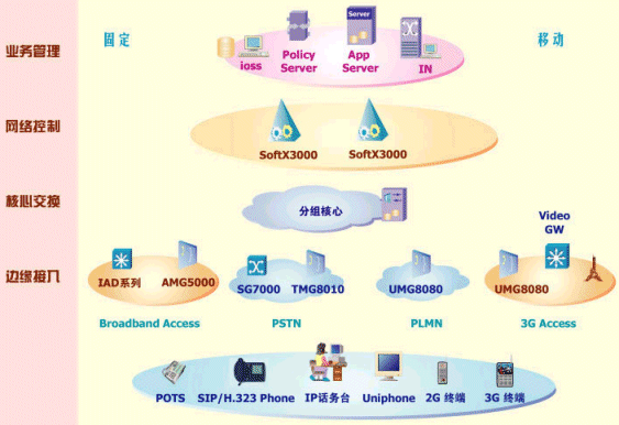 普通用戶可通過(guò)智能分組話音終端、多媒體終端接入,通過(guò)接入媒體網(wǎng)關(guān)、綜合接入設(shè)備(IAD)來(lái)滿足用戶的語(yǔ)音、數(shù)據(jù)和視頻業(yè)務(wù)的共存需求。