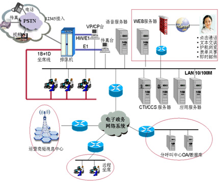 針對政府目前熱線電話眾多,管理不規(guī)范,資源無法共享的問題,華為公司提出的基于資源整合理念的解決方案,采用華為公司呼叫中心技術構建完整的計算機電信集成(CTI)系統(tǒng)體系,并充分利用政府現(xiàn)有的信息網絡資源,一方面整合原有分散的熱線,啟用12345政府熱線號碼統(tǒng)一接入;另一方面將自動語音查詢、人工服務、信息資料處理緊密結合起來,依托地方政府各類業(yè)務技術支持系統(tǒng)和網絡系統(tǒng),建立一套通暢的來電業(yè)務公文流轉系統(tǒng),通過人工受理或自動語音服務等方式,為人民群眾提供全天候24小時不間斷的服務。最終整合現(xiàn)有的全部政府部門政府熱線資源,使政府政府熱線服務范圍覆蓋到政府公共服務的全部領域,為市民提供全方位、全天候、高效率的政府政府熱線服務,市民只記一個電話號碼,只打一次電話,就能得到政府答復和服務。