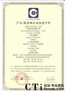 華為獲得國內第一張交換機產品碳足跡認證證書