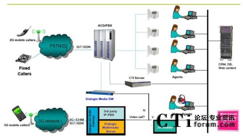 Bridge與web server連接,3G Bridge起的主要作用就是把web上的HTTP轉(zhuǎn)換成RTP\RTSP文件,這樣就完成了web與3G手機(jī)的互動(dòng),同樣的,如果您想和傳統(tǒng)的呼叫中心進(jìn)行連接,只需要用Dialogic的媒體服務(wù)器接入舊有的ACD\PBX里,就可以把3G與2G
