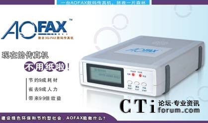 CTI論壇(ctiforum)10月20日消息(記者 潘婷婷):傳真機(jī)自1906年發(fā)明以來,到今天已走過一百多年的歷史,傳真的形式也從最早的機(jī)械傳真機(jī)、光電傳真機(jī)、數(shù)字傳真機(jī)發(fā)展到今天的電子傳真、電腦傳真、網(wǎng)絡(luò)傳真、無紙傳真、傳真軟件、傳真系統(tǒng)、傳真服務(wù)器等。其中,由金恒科技(深圳)有限公司推出的傲發(fā)3G-FAX電子傳真系列產(chǎn)品(AOFAX),是新一代傳真的典范,引領(lǐng)著未來傳真發(fā)展的方向。