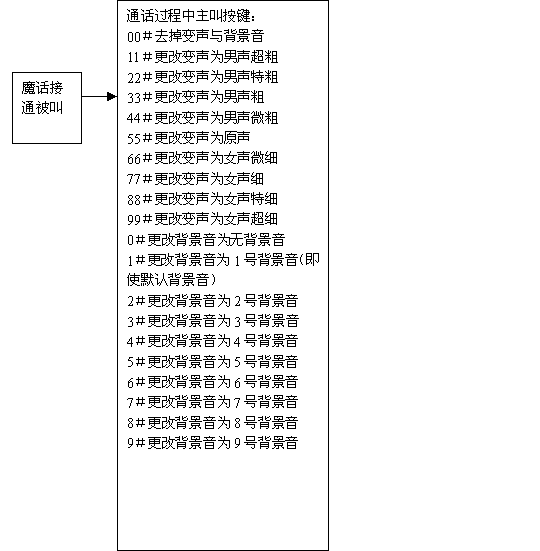 變聲通話功能也叫魔話功能,是指用戶(hù)通過(guò)通過(guò)播打特殊的號(hào)碼接入到本平臺(tái)后,再通過(guò)本平臺(tái)去呼叫最終的被叫用戶(hù),在這樣的一個(gè)通話過(guò)程中,可以通過(guò)本平臺(tái)提供8級(jí)變聲和原聲功能:"男聲超粗、男聲特粗、男聲粗、男聲微粗、原聲、女聲微細(xì)、女聲細(xì)、女聲特細(xì)、女聲超細(xì)"。在通話過(guò)程中實(shí)時(shí)變聲,并可按鍵選擇改變變聲系數(shù)或恢復(fù)原聲,趣味非凡,超常體驗(yàn)。