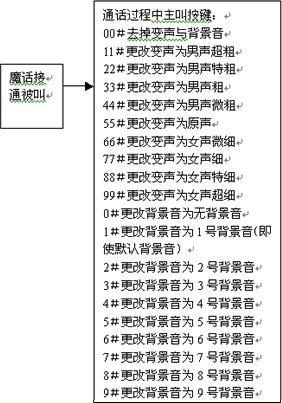 變聲通話功能也叫魔話功能,是指用戶通過通過播打特殊的號碼接入到本平臺后,再通過本平臺去呼叫最終的被叫用戶,在這樣的一個通話過程中,可以通過本平臺提供8級變聲和原聲功能:“男聲超粗、男聲特粗、男聲粗、男聲微粗、原聲、女聲微細(xì)、女聲細(xì)、女聲特細(xì)、女聲超細(xì)”。在通話過程中實(shí)時變聲,并可按鍵選擇改變變聲系數(shù)或恢復(fù)原聲,趣味非凡,超常體驗(yàn)。