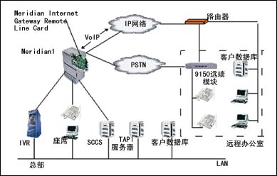 采用北電網(wǎng)絡(luò)的RemoteOffice解決方案。對于主叫用戶,與原來的撥號方案完全一樣;對于話務(wù)員座席,只是將交換機(jī)的數(shù)字座席通過廣域網(wǎng)或者專線方式連到遠(yuǎn)端。該方案在呼叫中心的PBX上安裝北電的Meridian