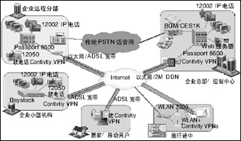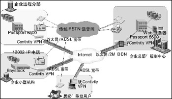 在企業(yè)網(wǎng)上加載北電網(wǎng)絡話音設備(BCM,CSE1K或ITG/M1),再配合上北電網(wǎng)絡的IP電話i2002/i2004,或在移動用戶的PC上安裝i2050