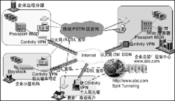 企業(yè)總部/數(shù)據(jù)中心基本采用DDN專線或租用以太網(wǎng)鏈路連接到本地服務提供商(ISP),此時Contivity (Contivity 4600/5000)獲得固定的合法IP地址,大型遠程分支機構(gòu)同樣可以采用DDN專線的方式連接到本地服務提供商(ISP),此時分部的Contivity(Contivity