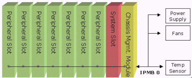 - 標(biāo)準(zhǔn)型IPMI系統(tǒng):利用背板上的IPMB總線,在系統(tǒng)槽上的CompactPCI單板上設(shè)計一顆BMC的控制器,其余在PCI插槽上的外圍片只要存在簡單的IPMI命令兼容的控制器,系統(tǒng)槽的單板即可透過IPMB讀取所有外圍片的狀態(tài),然后再經(jīng)由序列或是網(wǎng)絡(luò)的形式通知系統(tǒng)管理者。