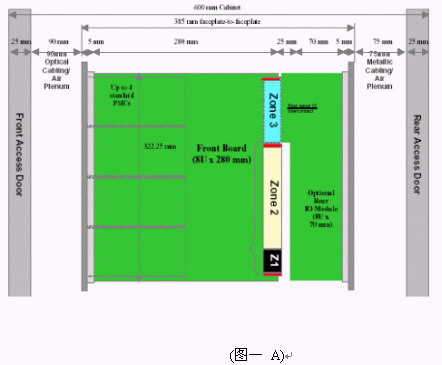我們可以看到當(dāng)今市面上已有相關(guān)的零件商或系統(tǒng)商開發(fā)出14U或13U,12U的ATCA機箱。就ATCA機箱的型式來說可以分為直立型插卡與橫向型插卡兩種類型。直立式插卡機箱的標(biāo)準(zhǔn)為14槽(參考圖一B),而橫向型機箱因受限于機箱高度,所以視其高度決定槽數(shù)的多少。 ATCA的架構(gòu)主要包括以下部分:正面插槽,RTM,PEM,背板,CMMs,散熱系統(tǒng)。(參考圖一與圖二)