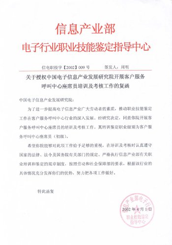中國電子信息產(chǎn)業(yè)發(fā)展研究院職業(yè)技能培訓(xùn)部是中國電子信息產(chǎn)業(yè)發(fā)展研究院旗下專業(yè)從事IT職業(yè)技能培訓(xùn)的機構(gòu)。呼叫中心職業(yè)技能培訓(xùn)工作是培訓(xùn)中心常年開展的主要培訓(xùn)項目。培訓(xùn)中心受信息產(chǎn)業(yè)部委托,負責(zé)全國范圍內(nèi)"呼叫中心客戶服務(wù)座席員"的授權(quán)培訓(xùn)及考核工作。既是呼叫中心行業(yè)基礎(chǔ)操作人員培訓(xùn)及考核的權(quán)威機構(gòu),又是配合行業(yè)管理、全面支撐和提升整個呼叫中心產(chǎn)業(yè)的服務(wù)機構(gòu)。