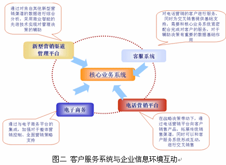 客戶服務系統(tǒng)不是孤立的系統(tǒng),是能夠與客戶現(xiàn)有信息環(huán)境,包括:核心業(yè)務系統(tǒng)、多渠道營銷、電子商務等進行互動的智能信息系統(tǒng),從而使呼叫中心成為企業(yè)的戰(zhàn)略資產(chǎn),幫助企業(yè)提升客戶滿意度、深度挖掘客戶價值。客戶服務系統(tǒng)與企業(yè)其它信息系統(tǒng)的互動可以通過圖二反映。