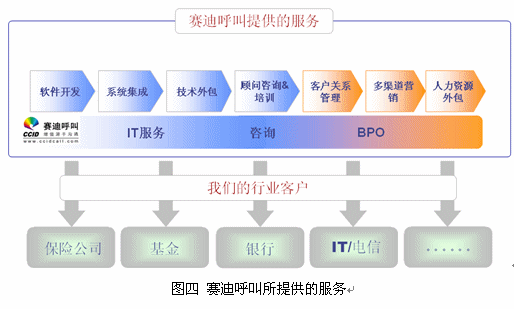 同時,賽迪呼叫所推薦給企業(yè)的并非只是軟件,而是結(jié)合了賽迪呼叫豐富的運營服務經(jīng)驗、技術(shù)服務能力的全方位信息化服務。賽迪呼叫的這種全面的信息化服務,涵蓋IT服務、咨詢服務、BPO等,圖四給出了相應展示。