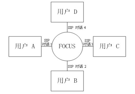 緊耦合會議的邏輯架構圖如圖三所示。會議中的核心是"會議中心(conference focus)",每一個會議都有一個會議中心,由一個URI標識,用戶通過聯(lián)系這個URI參加到一個會議中去。會議中心和用戶之間的拓撲結(jié)構為星性結(jié)構。會議中心為用戶提供并維持一個信令連接,并且可以執(zhí)行會議策略,實現(xiàn)對會議的控制和管理。