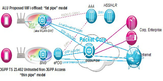 上述方案解決了WiFi分流的認(rèn)證問題,上海貝爾的方案中,將WLAN的GW功能引入到7750 SR業(yè)務(wù)路由器上,該功能通過7750 SR上的AA-ISA多業(yè)務(wù)板卡實(shí)現(xiàn)。WiFi分流為確保安全性,在3GPP TS 23.402中,對WiFi終端的接入,采取了一種所謂瘦管道的模式,即要從用戶端向網(wǎng)關(guān)發(fā)起IP-Sec連接,而AP僅充當(dāng)橋的作用,對于PC或平板電腦等終端,這不是什么問題,但對于手機(jī)而言,IP-Sec將帶來非常大的負(fù)荷,不僅影響終端上應(yīng)用的相應(yīng)速度,同時(shí)對電池的消耗非常之大,就目前情況看,市場上支持該功能的手機(jī)非常少。上海貝爾的方案中,采用了胖管道的模式,通過從AP向網(wǎng)關(guān)建立IP-Sec或GRE隧道,顯著降低了對移動(dòng)終端的要求,不僅使得移動(dòng)終端的成本得以下降,同時(shí)延長了終端的使用時(shí)間,更重要的是,擴(kuò)大了運(yùn)營商推廣WiFi 分流方案的適用群體。