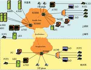 杭州秋濤局配置的是A7505中繼網(wǎng)關(guān)、A1540接入網(wǎng)關(guān)以及其他的綜合接入設(shè)備、SIP終端、H.323終端等。A7505同當(dāng)?shù)亟粨Q機(jī)配合可以經(jīng)由IP骨干網(wǎng)實(shí)現(xiàn)上海到杭州的長(zhǎng)途語(yǔ)音業(yè)務(wù)。A1540及經(jīng)由它的ST700可以實(shí)現(xiàn)NGN的語(yǔ)音數(shù)據(jù)業(yè)務(wù)。杭州到上海的連接是通過(guò)中國(guó)電信的IP骨干網(wǎng)實(shí)現(xiàn)的。
