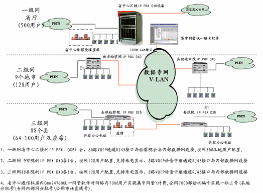 根據(jù)合同,阿爾卡特將提供1套Omni PCX Enterprise(面向大中型企業(yè)的通信平臺)500用戶作為核心交換節(jié)點,97套Omni PCX Office(面向中小型企業(yè)的通信平臺)系統(tǒng)分別為60-160用戶作為分支交互節(jié)點。全網(wǎng)支持多達7000多個用戶,覆蓋貴州省檢察院、9個地市檢察院和88個區(qū)縣檢察院。在設(shè)計組網(wǎng)方案時,阿爾卡特根據(jù)用戶的需求和實際情況,并充分考慮現(xiàn)有的數(shù)據(jù)網(wǎng)絡(luò)資源,提出采用點對多點的網(wǎng)絡(luò)結(jié)構(gòu)建設(shè)VOIP語音網(wǎng)絡(luò),不僅可以充分保障通信的安全性和可靠性,同時還可最大限度保護現(xiàn)有投資,節(jié)省費用。