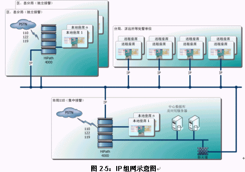 圖 2-5給出了使用純IP實施城市110組網(wǎng)的最普遍的示意。從該圖可以看出,無論采用集中接警還是分散處警,C&CC特別使用于使用純IP技術(shù)實施全市(包括所轄縣級市)110組網(wǎng)。考慮到目前全國公安二、三、四級網(wǎng)建設(shè)日漸成熟,使用純IP技術(shù)實施全市110組網(wǎng)并實現(xiàn)"三警合一"確實是經(jīng)濟、靈活而方便的選擇,前文提到的芬蘭112全國組網(wǎng)使用的也是這樣的技術(shù)。當(dāng)然,現(xiàn)存的傳統(tǒng)公安通訊專網(wǎng)仍然可以作為備份話務(wù)路由存在。
