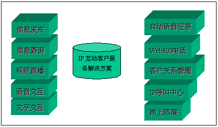 經(jīng)過對比分析,我們發(fā)現(xiàn),目前國際國內(nèi)市場上很多客戶服務產(chǎn)品,大都僅僅完成客戶服務的一部分。北極星“IP互動客戶服務中心解決方案”則引入互動客戶服務(ICS:Interactive Customer Service)系統(tǒng)以及數(shù)碼互動直播的概念,形成了由視頻點播、網(wǎng)上路演、語音和文字交互、IP客戶服務中心、Web800語音電話、實時服務中心、專家實時在線、客戶關系管理、在線尋呼系統(tǒng)和客戶社區(qū)服務系統(tǒng)等全方位的服務內(nèi)容。該方案主要基于IP架構(gòu),系統(tǒng)擴展性非常靈活,系統(tǒng)體現(xiàn)的客戶服務思想非常能夠滿足我們的需求。2001年3月,經(jīng)過一段時間的試運行后,我們正式推出了這套“IP互動客戶服務”系統(tǒng)。