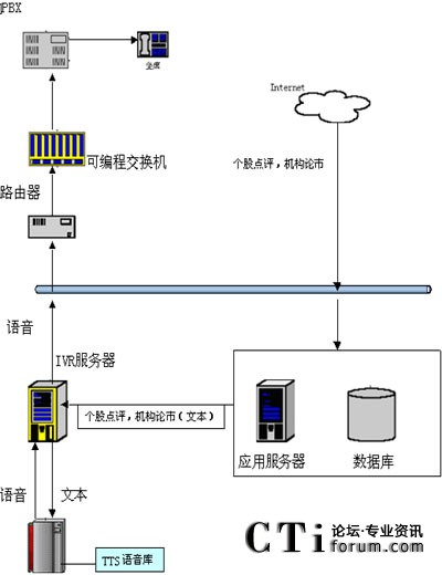 在技術(shù)上,用戶可以通過電話提交他的查詢請求(比如使用按鍵方式),IVR服務(wù)器收到請求后會向其他應(yīng)用服務(wù)器提交此查詢請求,當IVR得到查詢結(jié)果后,他會將文本形式的查詢結(jié)果交給jTTS服務(wù)器,jTTS服務(wù)器會返回查詢結(jié)果的語音形式,最終語音會在坐席上播放,用戶就可以聽到他剛才所要查詢的信息。(如圖所示)
