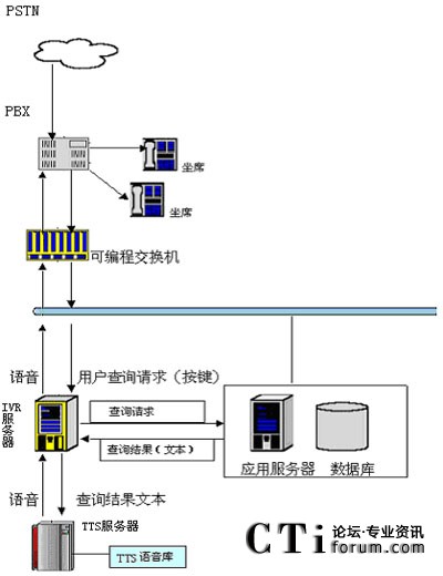 用戶撥打統(tǒng)一特服號碼進(jìn)入客戶服務(wù)系統(tǒng),經(jīng)過自動語音系統(tǒng)提示,選擇公共信息查詢項目。用戶可以通過電話提交他的查詢請求(比如使用按鍵方式),IVR服務(wù)器收到請求后會向其他應(yīng)用服務(wù)器提交此查詢請求,當(dāng)IVR得到查詢結(jié)果后,他會將文本形式的查詢結(jié)果交給jTTS服務(wù)器,jTTS服務(wù)器會返回查詢結(jié)果的語音形式,最終語音會在坐席上播放,用戶就可以聽到他剛才所要查詢的信息。