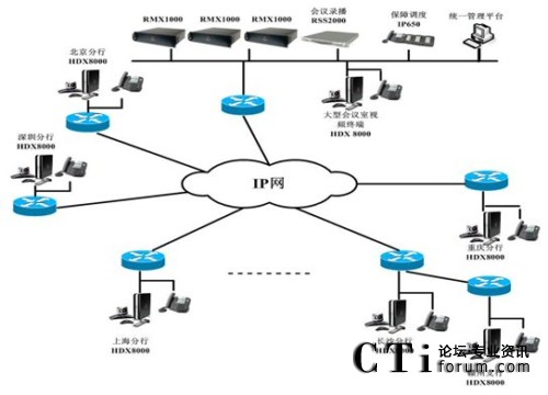 RMX1000作為多媒體多點(diǎn)處理單元,70臺(tái)HDX8006和HDX8002分布在全國(guó)各個(gè)分行作為視頻會(huì)議的接入,RSS2000服務(wù)器提供HD的會(huì)議錄制;65臺(tái)IP電話作為實(shí)時(shí)會(huì)議備份系統(tǒng);整個(gè)系統(tǒng)提供720P/60幀或1080P/30幀的會(huì)議畫(huà)面質(zhì)量,音頻達(dá)到22KHz寬帶音質(zhì),劇院級(jí)音質(zhì)享受,具備新一代高清雙流P