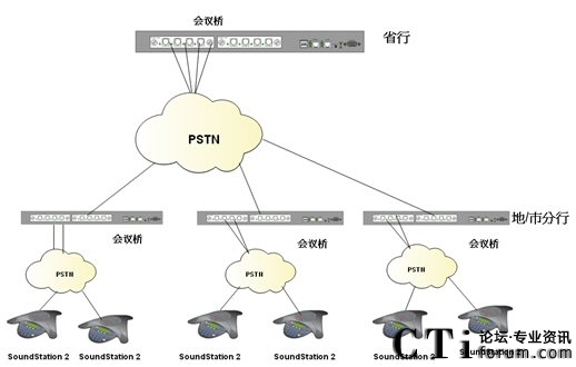 根據(jù)客戶需要在降低會議成本的前提下實(shí)現(xiàn)快速、便捷、實(shí)時的多點(diǎn)之間多人會議溝通的需求,我們制定了以下解決方案;系統(tǒng)利用傳統(tǒng)電話網(wǎng)絡(luò),是客戶擁有自己的會議管理系統(tǒng);省行方面使用Polycom SS2基本型商務(wù)會議電話或普通模擬電話;各個市/縣級分行,根據(jù)自己會場的情況自選設(shè)備;