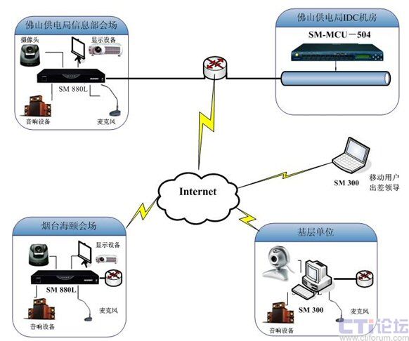 MCU 504,主要放置于電力局總部,在4個(gè)會議配備硬件終端使用SM 880L,另外桌面軟件終端使用SM 300。